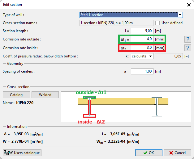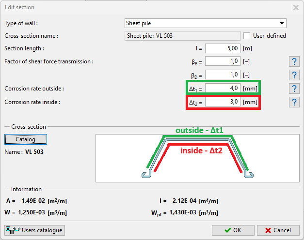The corroded cross-section is used for steel section dimensioning purposes in the sheeting check program.