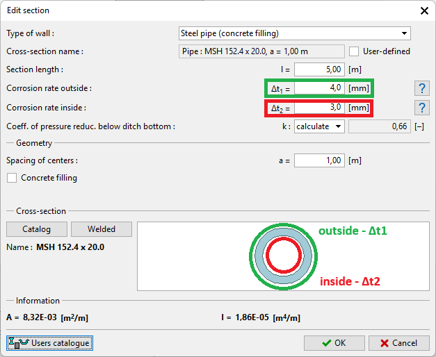 Corrosion losses can be specified for steel cross-sections for casing structures: