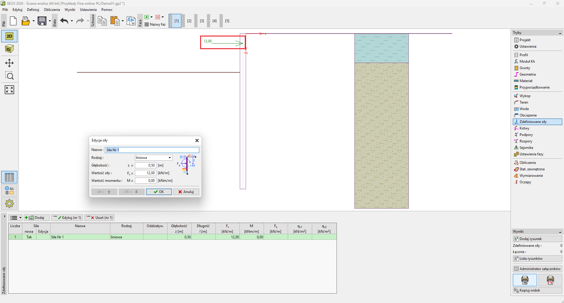 Zdefiniowane siły reprezentują dodatkowe obciążenia oddziałujące na konstrukcje oporową, ścianę wykopu czy nasyp zbrojony. W ten sposób można modelować elementy takie jak: bariery drogowe, uderzenie samochodu czy obciążenia od bilboardów i reklam. Program nie dostosowuje (nie zmienia) w żaden sposób zdefiniowanych sił w toku obliczeń, za wyjątkiem przemnażania ich przez odpowiednie współczynniki zgodnie z wybranym rodzajem oddziaływania (EN1997, LRFD).