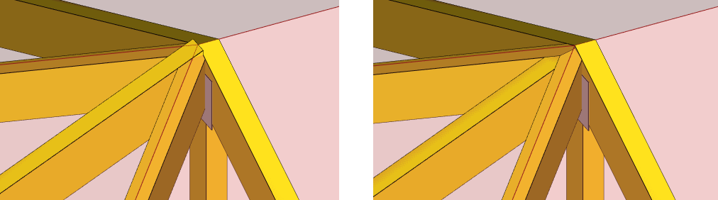 Pomocí nastavení "Symetrický úkos jednostranného vazníku - symetrická špička" je možné, zda se jednostranné úkosy (seříznutí vůči jednomu vazníku) mají vytvářet za pomoci dvou symetrických řezů nebo pouze jednoho. První způsob zjednodušuje výrobu i montáž konstrukce, neboť není nutné řešit levostranné a pravostranné varianty shodných vazníků, druhý způsob naopak poskytuje vhodnější detail pro vytváření nosného spoje.