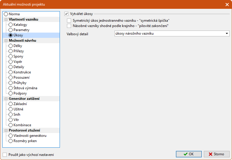 V této části lze nastavit, zda se mají v konstrukci vytvářet úkosy. Úkosy jsou koncové řezy na pásnicích, které slouží ke snadné montáži vazníku na vazník, pokud spolu nesvírají kolmý úhel. Tvorba úkosů se zapíná přepínačem "Vytvářet úkosy". Pokud toto nastavení není zapnuté, program ukončuje vazníky kolmým řezem tak, aby bylo možné provést úkos dodatečně až na stavbě.